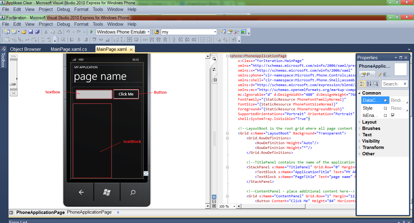 - Klick TextBox, TextBlock dan button, masukkan pada layar emulator pada Windows Phone 7.1